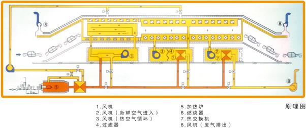 橋式烘干室是應用對流傳熱的原理,以熱空氣為載體,通過對流的方式將熱量傳遞于工件使工件加熱,或利用遠紅外輻射電加熱使工件加熱,從而達到涂膜固化、水份烘干之目的。烘干設備結構主要有:烘干室室體、進出口端、熱交換系統、排廢(濕)系統、溫度控制系統、測溫系統、電氣控制系統等部分。